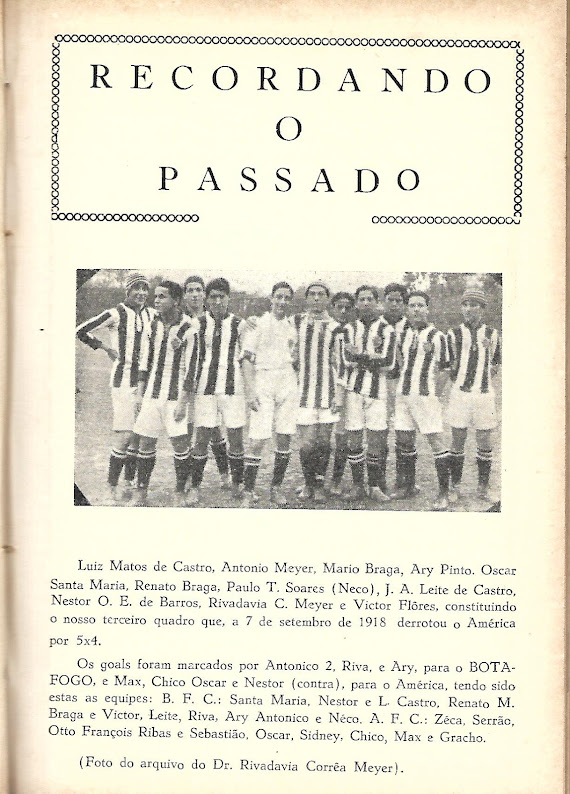 Em pé: Syla Soares, João Viana, Jorge Abreu e Adherbal Bastos; ajoelhado, João de Deus Candiota e sentados, Haroldo Días, Hilton Nabuco de Castro, Ernani Joppert, Octavio Bastos e Celso Coelho de Souza, que formaram nosso segundo quadro que, a 14 de julho de 1918, empatou por 1x1, com o do Fluminense.